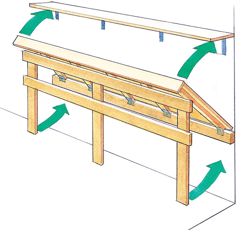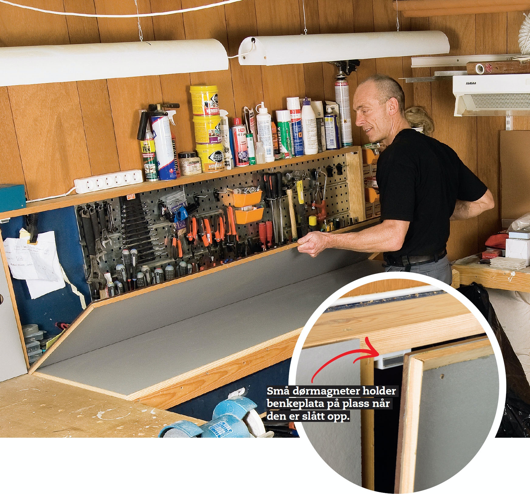 Det er praktisk å ha håndverktøyet rett foran deg ved arbeidsbenken når du skal bruke det. Men når du arbeider med maskiner som lager støv, kan det gå hardt ut over det samme verktøyet. Et par minutter med kappsaga eller litt sliping på benksliperen, så er det støv overalt. Om du da ikke sørger for å beskytte verktøyet med for eksempel ei benkeplate. Det praktiske er at det er hengslet ei ekstra, tynn benkeplate oppå benken. Når den slås opp, kommer den egentlige benkeplata til syne, og verktøyet er beskyttet mot støv fra sager og slipemaskiner. Du kan dessuten male og gjøre grovarbeidet på benkeplata som er slått ned, og arbeide på ei ren, fin benkeplate når plata er slått opp. Plata er satt fast med et pianohengsel og holdes lukket med skapdørmagneter.