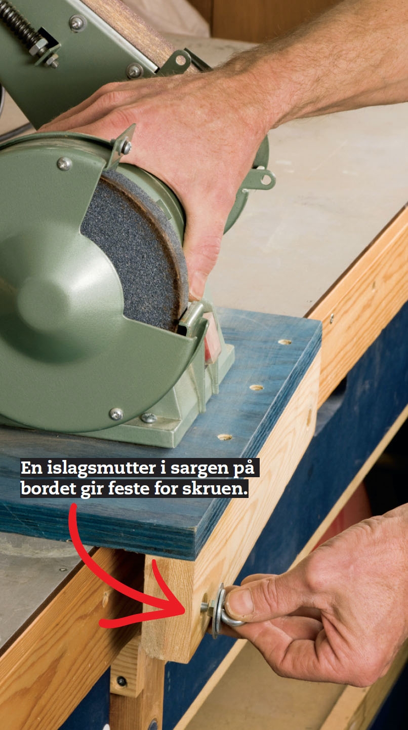De stasjonære maskinene er montert på plater som kan settes fast på arbeidsbenken. I lista som er montert under framkanten av plata, er det hull til en skrue som kan skrus inn i sargen under arbeidsbordet. Her er det slått inn islagsmuttere som gir feste for skruen.