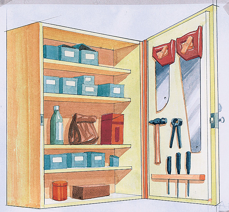 Det gjelder å utnytte veggplassen fullt ut i verkstedet. Men ofte er det fort gjort med hyller, skap og oppbevaringsmoduler. Da er det praktisk å kunne slå sammen den plasskrevende verktøytavla. Modellen vi viser her, består av noen plater mellom to kasser («skapet» på veggen og «døra») som er hengslet med pianohengsler og bretter seg ut når du åpner skapet, og kan klemmes sammen etterpå. Det er naturligvis en grense for hvor stor vekt hengslene kan bære. Med håndtak kan skapet også brukes som ei fl yttbar verktøykasse.