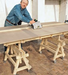 De mange slissene i bommene er til hjelp når du arbeider på dem - men de får ekstra mening når du skjærer et eller flere sett bordstøtter. Ved å flette bommer, bordstøtter og eventuelt ekstra støtter på langs av bommene, får du virkelig god støtte når du arbeider med store plater.