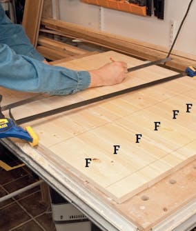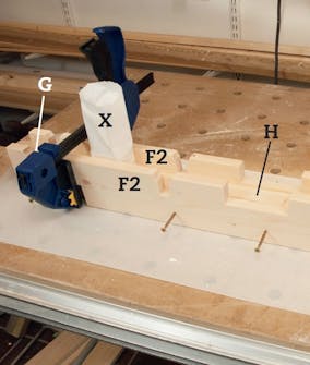 Alle bordene (F) merkes opp samlet, slik at slissene vil sitte helt likt. Vi spenner dem sammen og markerer deretter midtlinjerne til de 21 mm brede slissene, henholdsvis 5 og 30 cm inn fra begge ender.