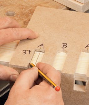 Sidene og bunnen på slissene tegnes opp ved hjelp av en mal. Det er mye enklere og mer nøyaktig enn å måle 9,5 mm ut til begge sider. Slissene skal være 21 mm brede og 37 mm dype.