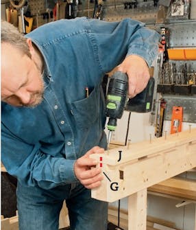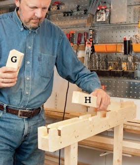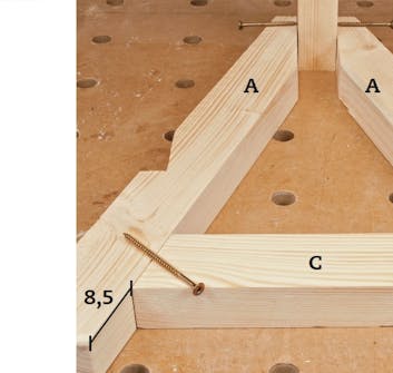 Så setter du sammen gavlene enkeltvis. I første omgang setter du bare beina (A) med tverrstiveren (C) sammen med lim og 90 mm skruer. Øverst settes lekten løst for å sikre riktig avstand.