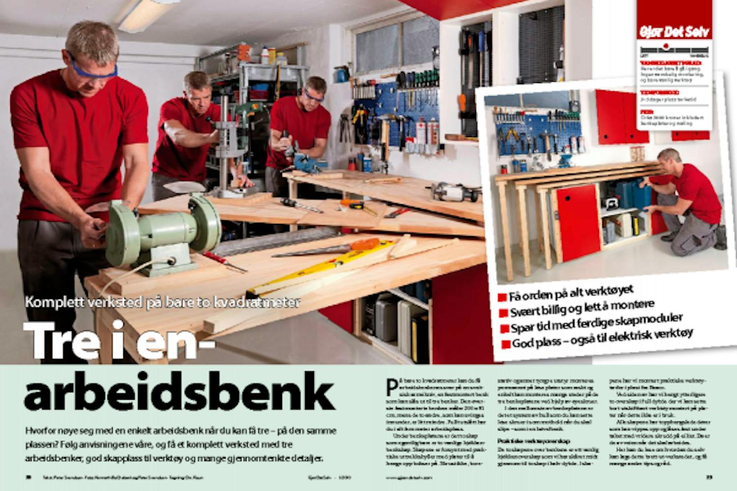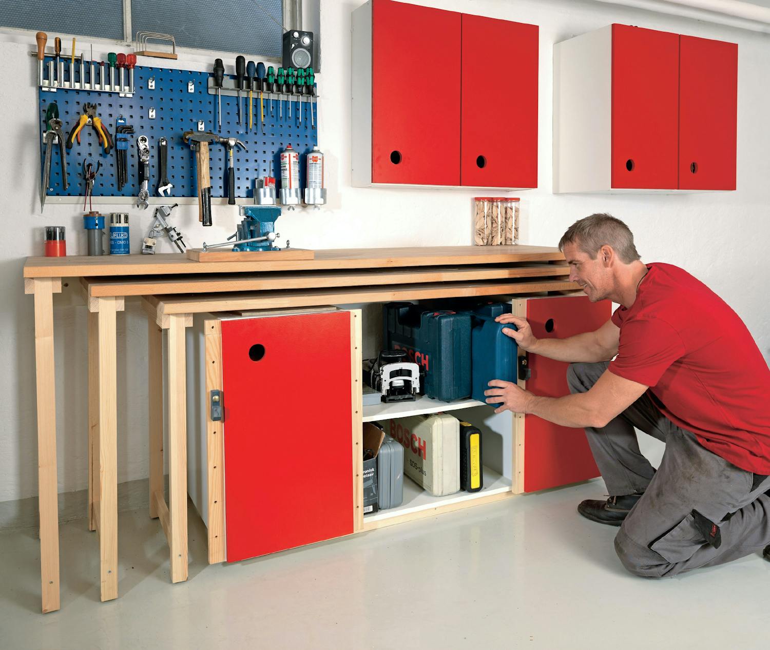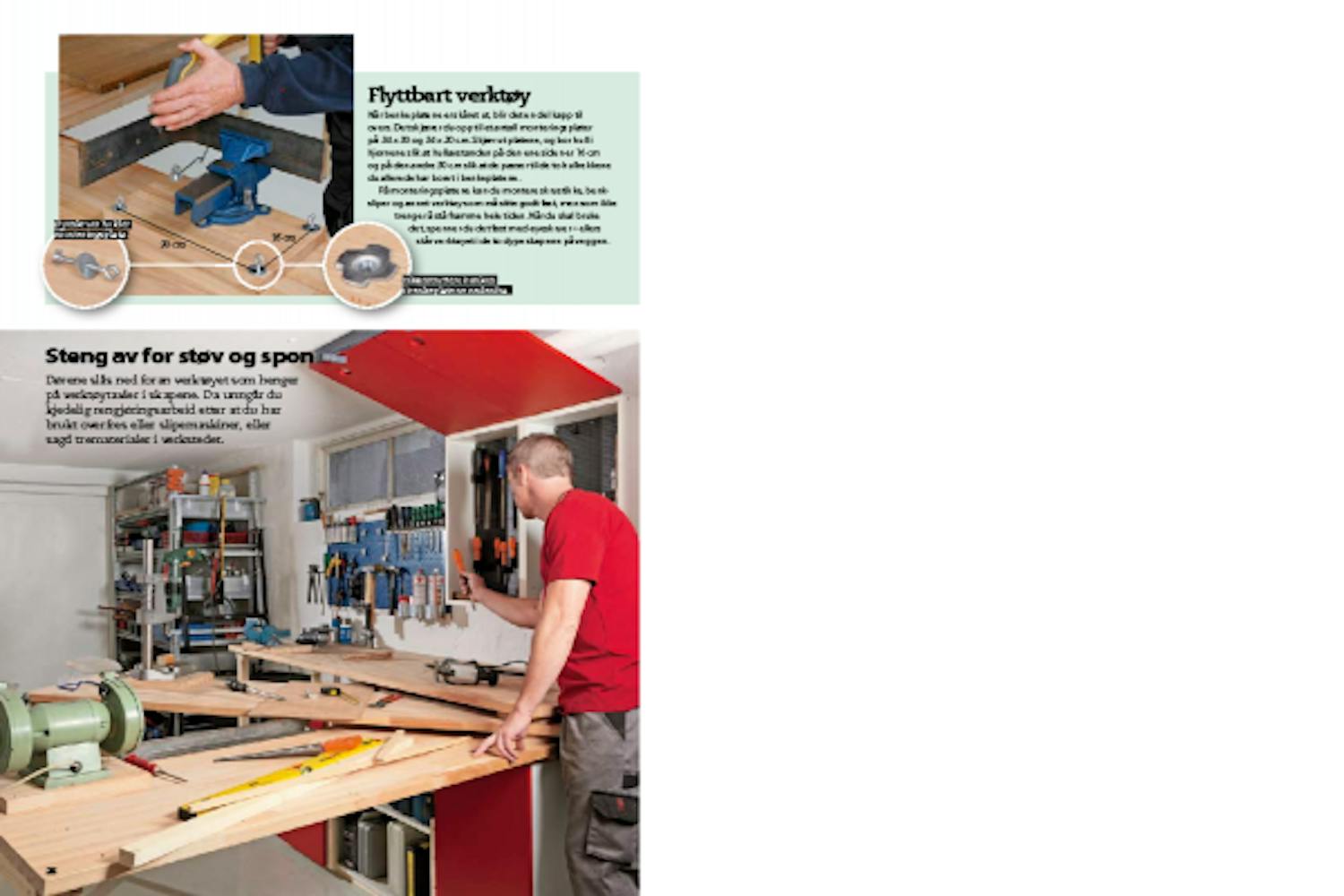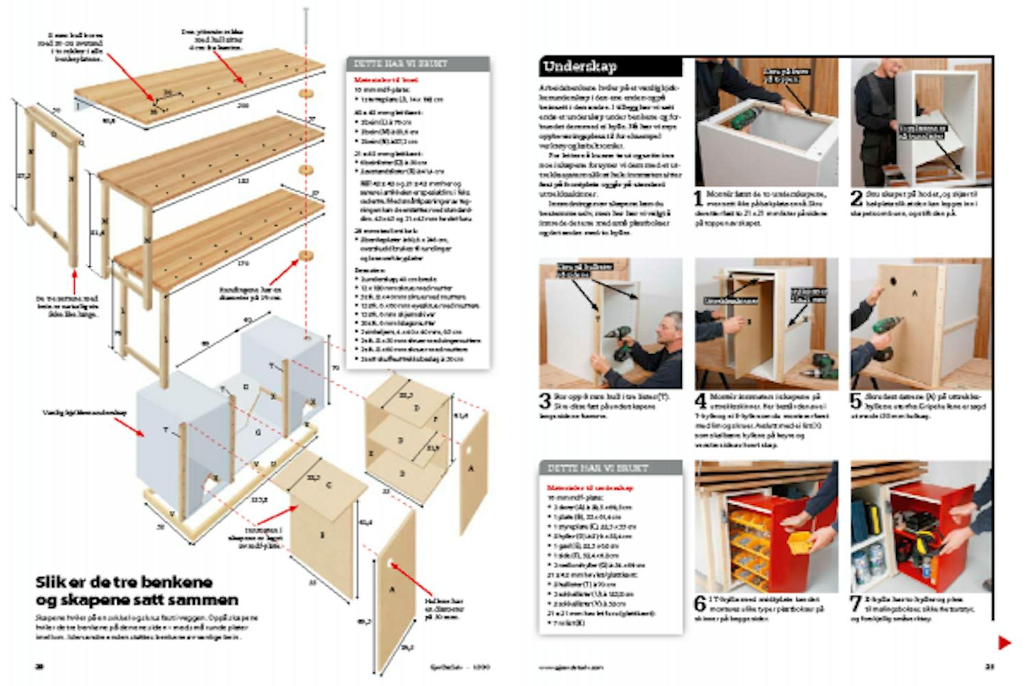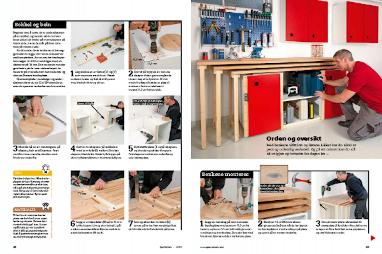 Arbeidsbenkene hviler på et vanlig kjøk-kenunderskap i den ene enden og på beinsett i den andre. I tillegg har vi satt enda et underskap under benkene og forbundet dem med ei hylle. Nå har vi mye oppbevaringsplass til for eksempel verktøy og kabeltromler.