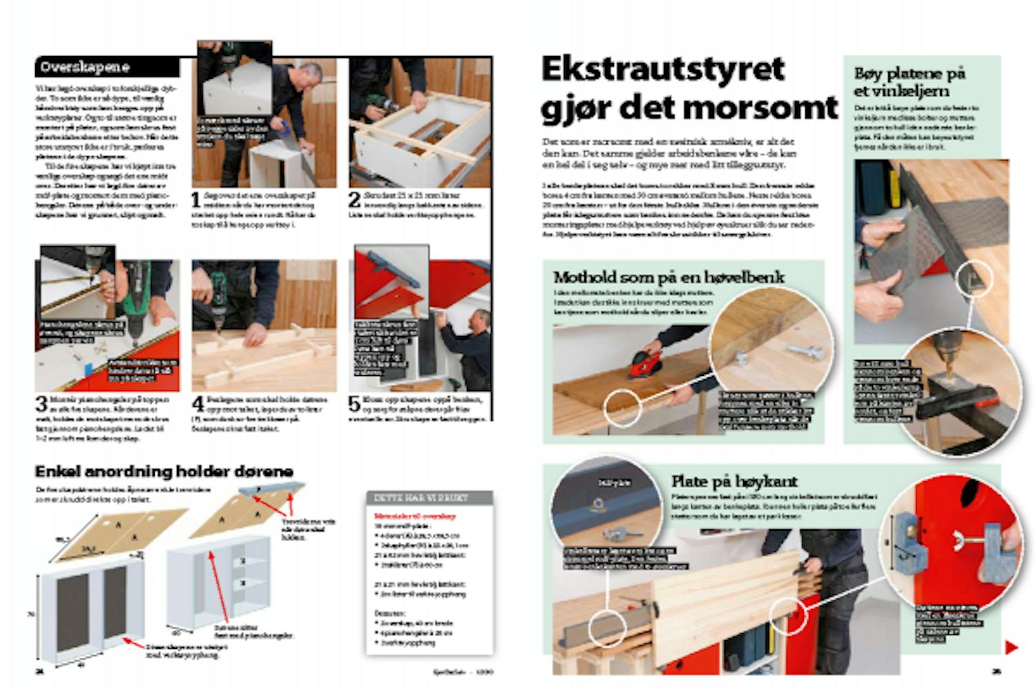 Vi har lagd overskap i to forskjellige dybder. To som ikke er så dype, til vanlig håndverktøy som kan henges opp på verktøyplater. Og to til større ting som er montert på plater, og som kan skrus fast på arbeidsbenkene etter behov. Når dette store utstyret ikke er i bruk, parkeres platene i de dype skapene.