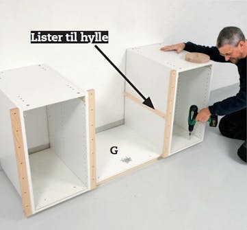 Sett de to skapene på sokkelen med bunnhylla (G) mellom. Skru fast skapene til sokkelen. Neste hylle legges på de to hyllebærelistene vi monterte tidligere.