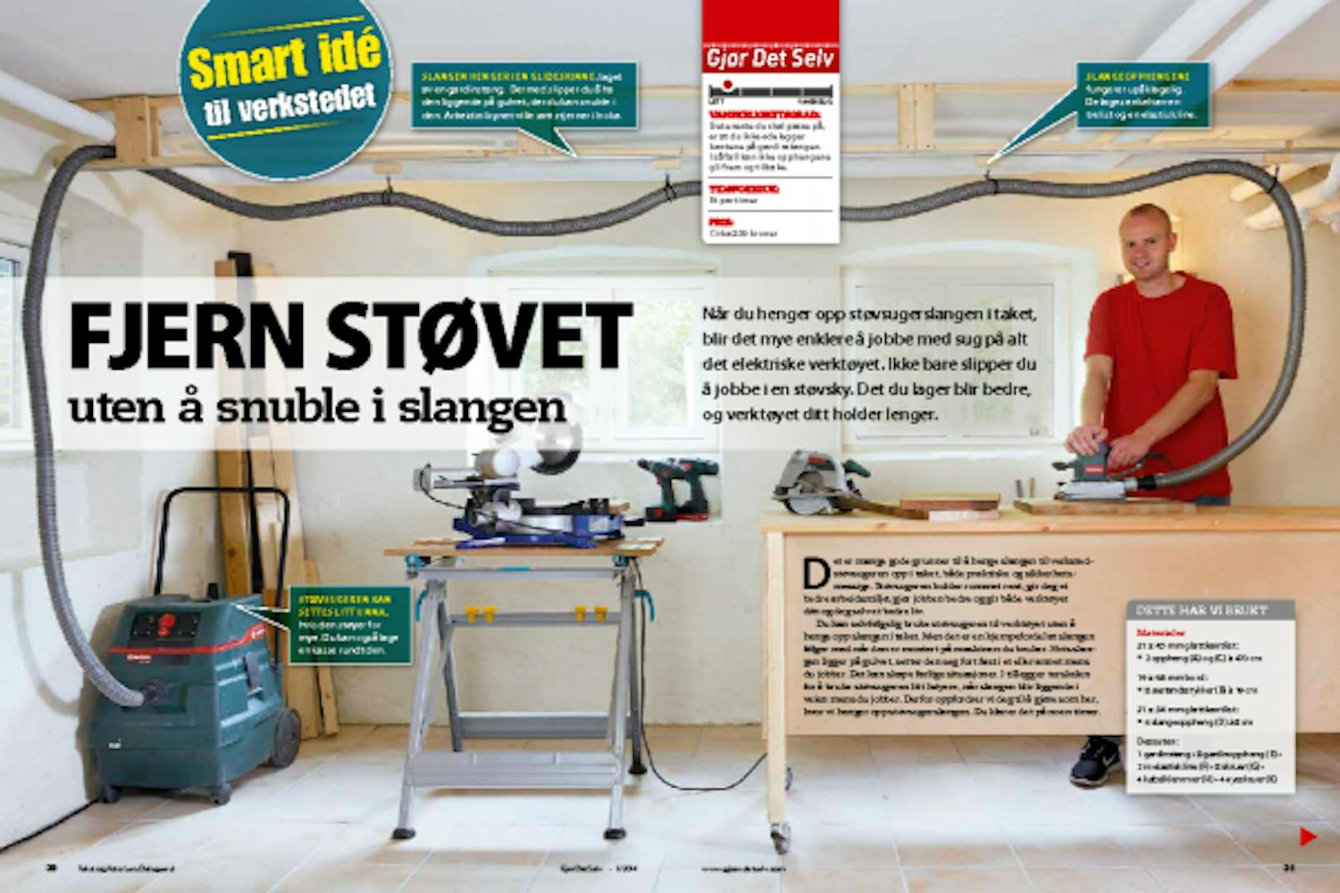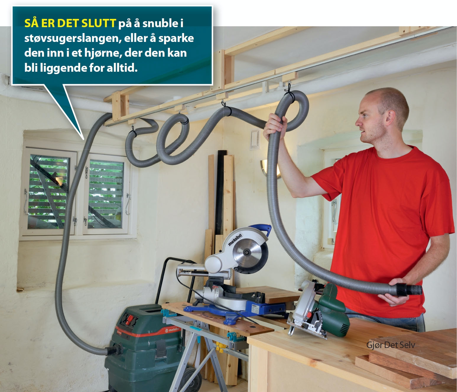 Slangen henges opp i sleider, som vi lager av en listestump og noen gardin-oppheng. Her lager vi bare fire sleider. Det passer til størrelsen på rommet, som er 470 cm fra vegg til vegg. Du kan lage flere eller færre oppheng, avhengig av forholdene i verkstedet ditt.