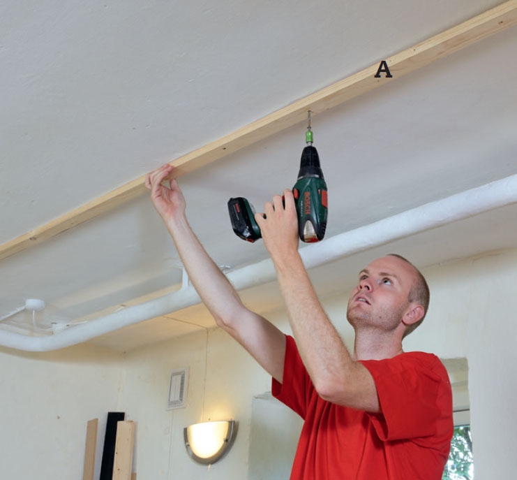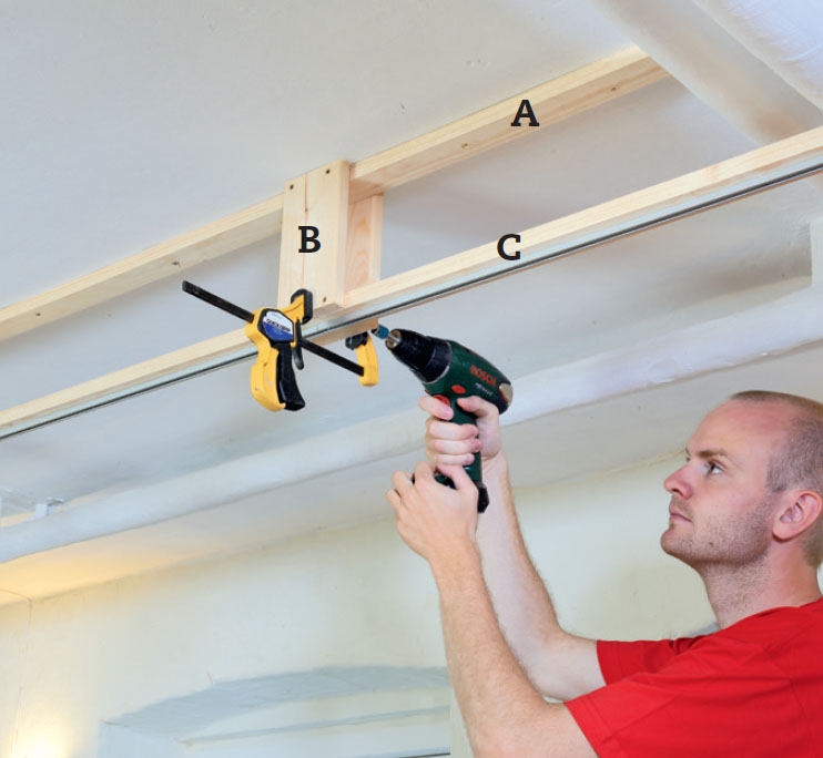 Skru fast avstandsbiter (B) på sidene av bordet (A) i taket. Bitene skal være akkurat så lange, at opphengsbordet (C) kan gå under rørene.