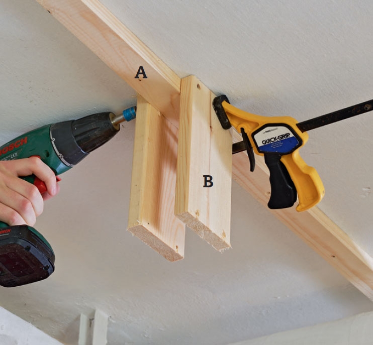 Skru fast et bord (A) i taket. Om du må bore og bruke plugger, eller du bare kan skru bordet rett opp i taket, avhenger helt av hva slags tak du har i verkstedet.