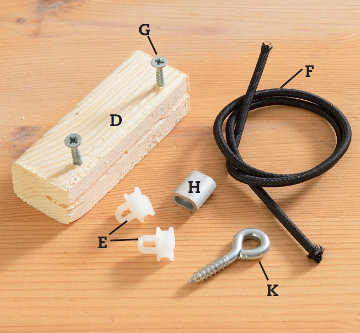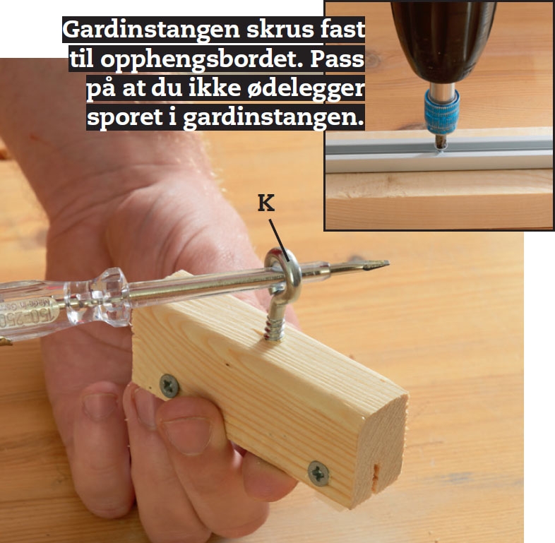 Lag et slangeoppheng av en listestump (D) på ca 8 cm, som du har laget et 2 mm bredt spor i. I sporet setter du fast to gardinoppheng (E) med hjelp av skruer (G). Lag til sammen fire oppheng.