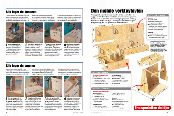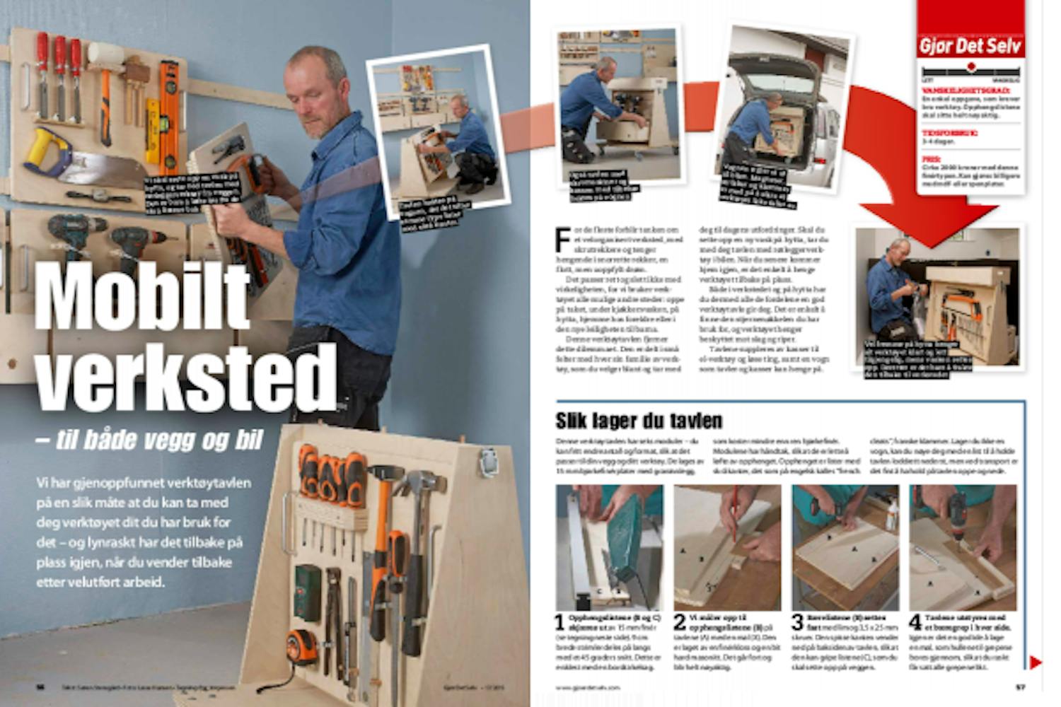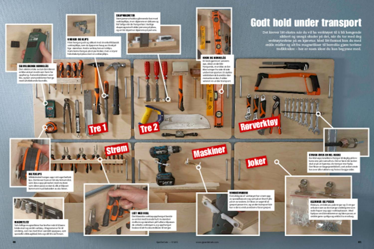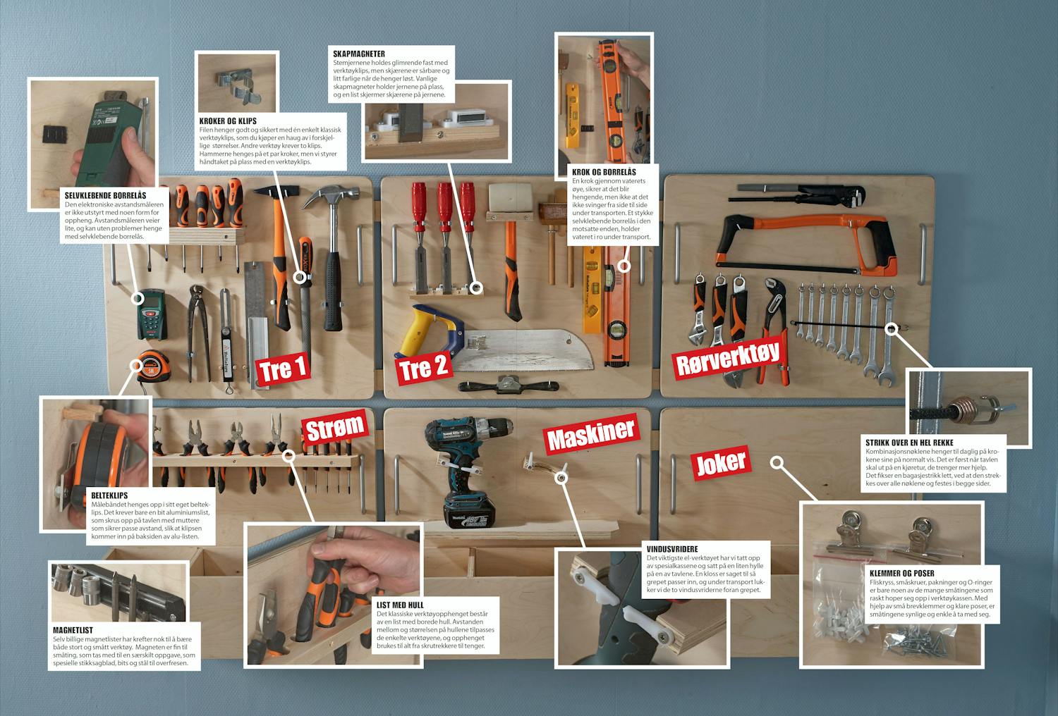 Denne verktøytavlen har seks moduler - du kan fritt endre antall og format, slik at det passer til din vegg og ditt verktøy. De lages av 15 mm bjørkefinérplater med graninnlegg, som koster mindre enn ren bjørkefinér. Modulene har håndtak, slik at de er lette å løfte av opphenget. Opphenget er lister med skrå kanter, det som på engelsk kalles “french cleats”, franske klammer. Lager du ikke en vogn, kan du nøye deg med en list til å holde tavlen loddrett nederst, men ved transport er det fint å ha hold på tavlen oppe og nede.