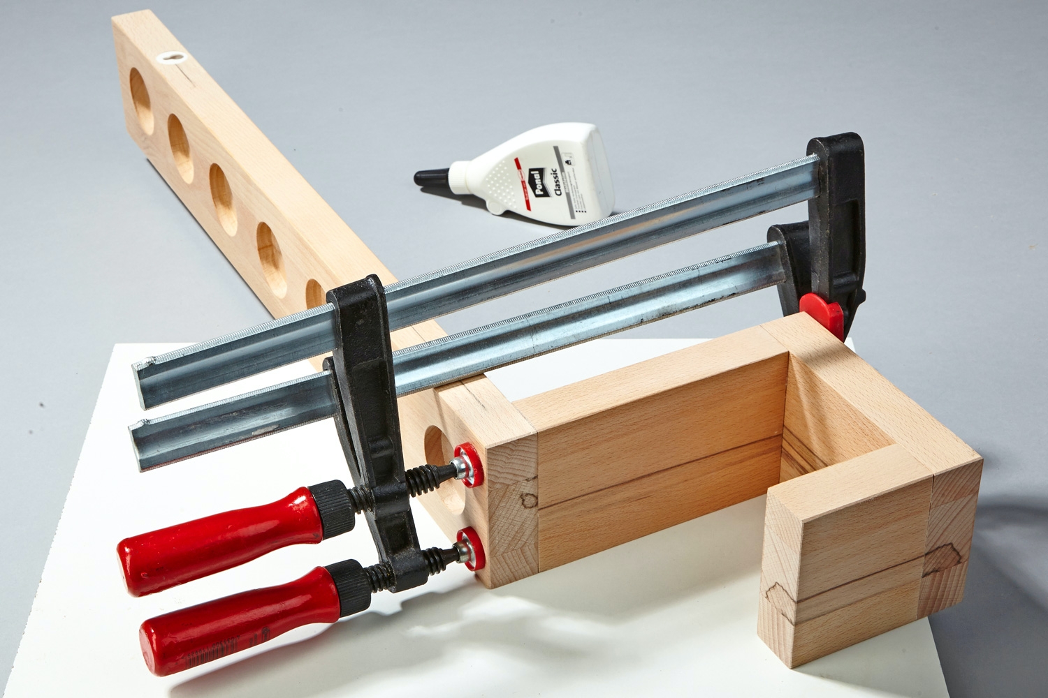 6. Lim sammen delene. Platestumpen er så tykk, og limflaten derfor så stor, at det fint kan holde med bare lim.