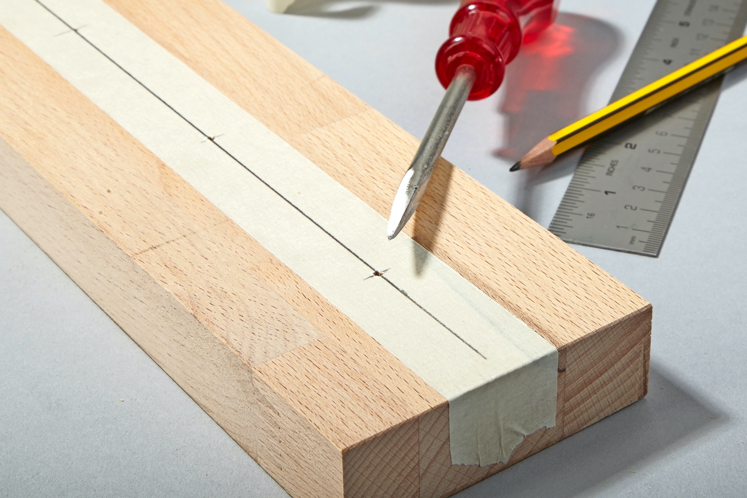 1. Merk opp hvor glassene skal være. Merkene tilsvarer sentrum på glassene. Setter du først på en strimmel maskeringsteip, slipper du å fjerne streken på treet etterpå.