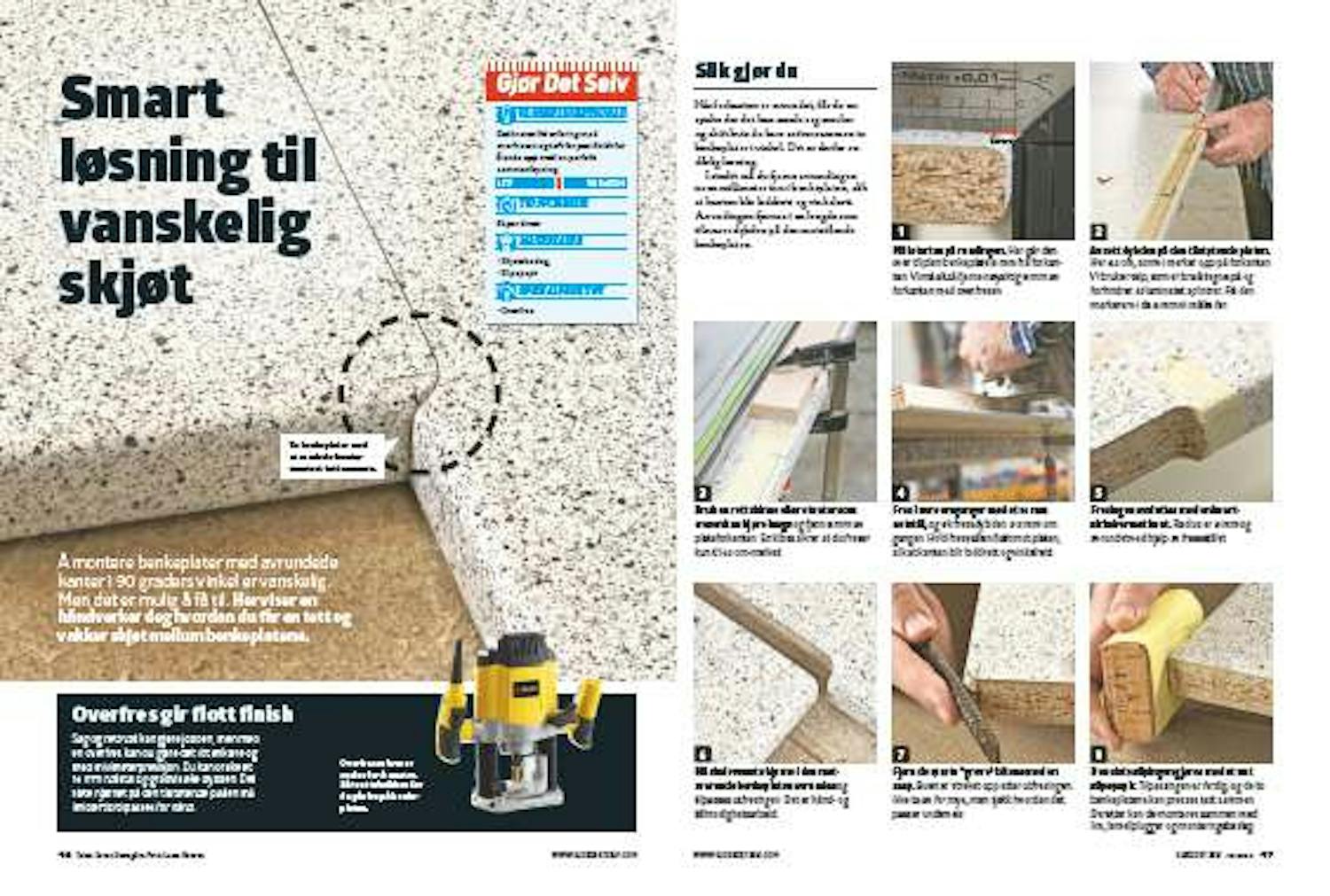 I stedet må du fjerne avrundingen noen millimeter inn i benkeplaten, slik at kanten blir loddrett og vinkelrett. Avrundingen fjernes i en lengde som tilsvarer dybden på den motstående benkeplaten.