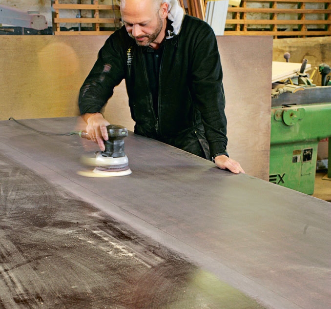 Slip støpeplaten. Ikke bruk grovere kornstørrelse enn 80, og avslutt med korn 200. Strukturen i overflaten på platen når den er slipt, blir den samme som den ferdige benkeplaten får.