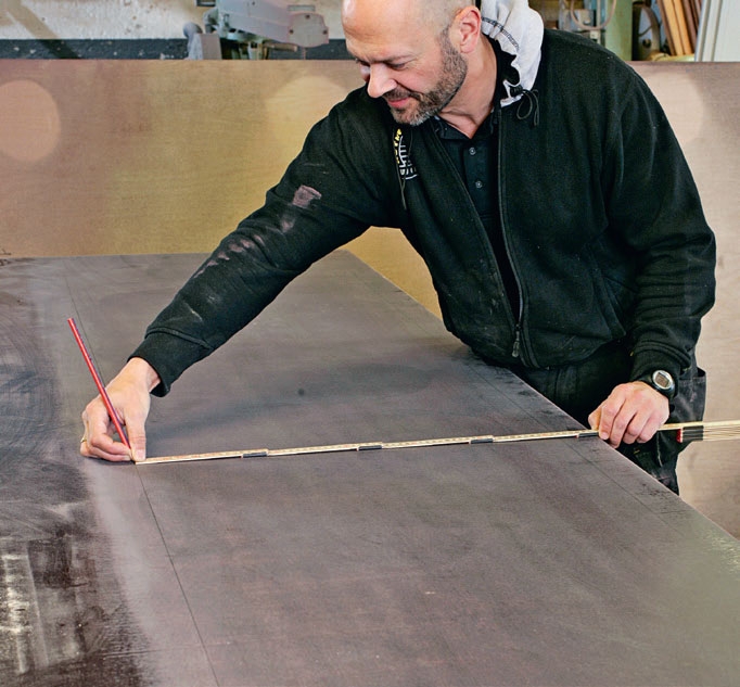 Presisjon er avgjørende her: Er strimlene skjeve, slik at de ikke sitter tett ned mot støpeplaten, renner betongen ut. Settes strimlene skjevt, blir også sidene på benkeplaten skjeve.