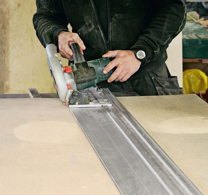 Vi lager formen på støpeplaten ved å skjære ut strimler som skal bli til sidene i formen. Vi vil støpe en 30 mm tykk benkeplate. Derfor er strimlene 30 mm brede. Vi skjærer dem ut av det overskytende fra forskalingsplaten. Du kan også lage dem av en annen plate, men den må minst være 16 mm tykk. Da vil den ikke bule ut når du heller betong i formen.