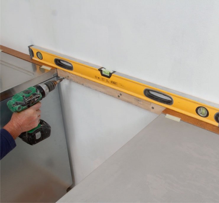 Her skrus en list fast på veggen, der komfyren skal være. Det gir en kant å sette opp flisene etter. Listen settes opp i nivå med et par masonittplater. De ligger på hver side av hullet til komfyren for å lage en fuge under den nederste flisrekken.