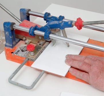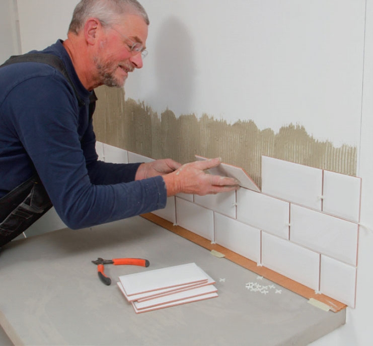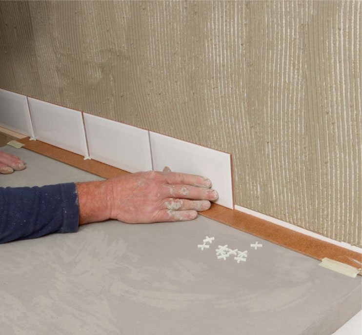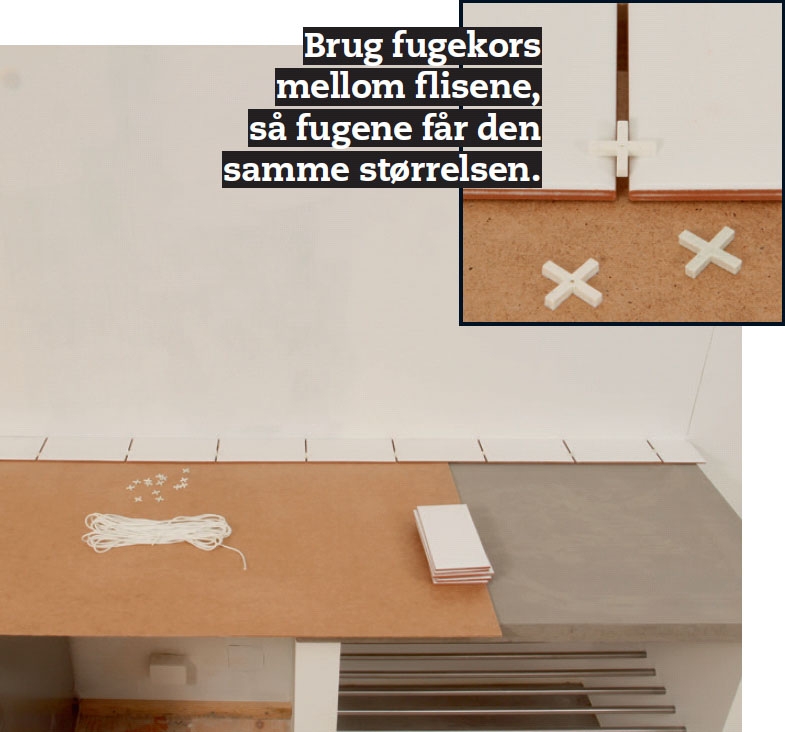 Sett opp den første rekken fliser. Flisene settes på en strimmel av masonitt, slik at det blir en fuge mellom fliser og benkeplate. Sett opp flisene, og plasser et fliskors mellom.