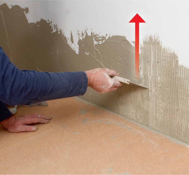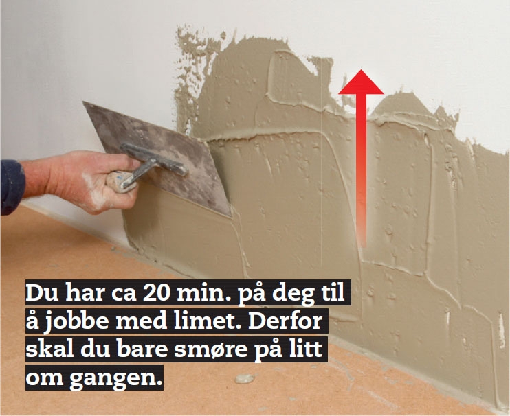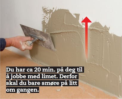 Trekk en 4 mm tannsparkel gjennom limet, mens sparkelen holdes i ca 60 graders vinkel på veggen. Gjør en test, ved å trykke en flis i limet og ta den av igjen. Hvis det er lim på fire femtedeler av flaten, er limet passe.