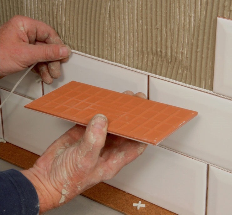 La en fugesnor styre de vannrette fugene. Når én rekke er avsluttet, legger du en fugesnor oppå og strammer den ut, mens du presser den neste rekken fliser fast i limet.