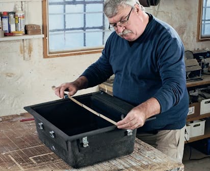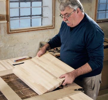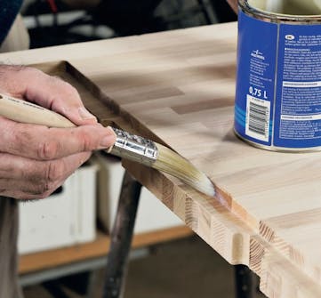 Vasken skal deretter limes fast i den freste falsen. Olje og lim gir dårlig vedhefting, så vi forsegler falsen med flere strøk med lakk. Spesielt falsens kant, som er kraftig sugende endeved, skal lukkes effektivt for å unngå problemer.
