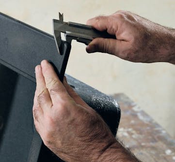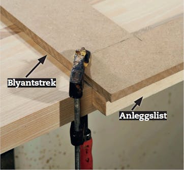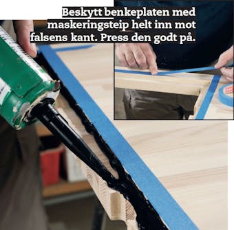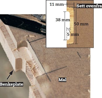 Mål vaskekantens tykkelse. Her er den 9 millimeter. Den freste falsen skal være 2 millimeter dypere end vaskekantens tykkelse, altså 11 millimeter.
