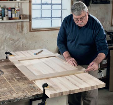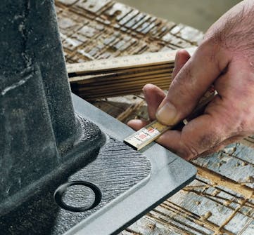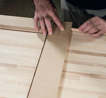 Plasser malen på benkeplaten, slik at hullet passer med det underliggende vaskeskapet. Marker fresemalens plassering med lette blyantstreker på begge yttersidene.