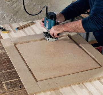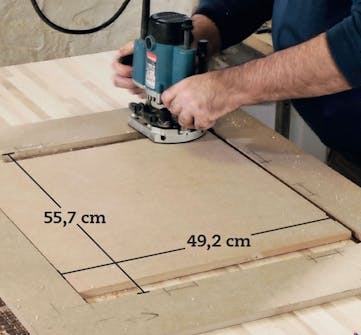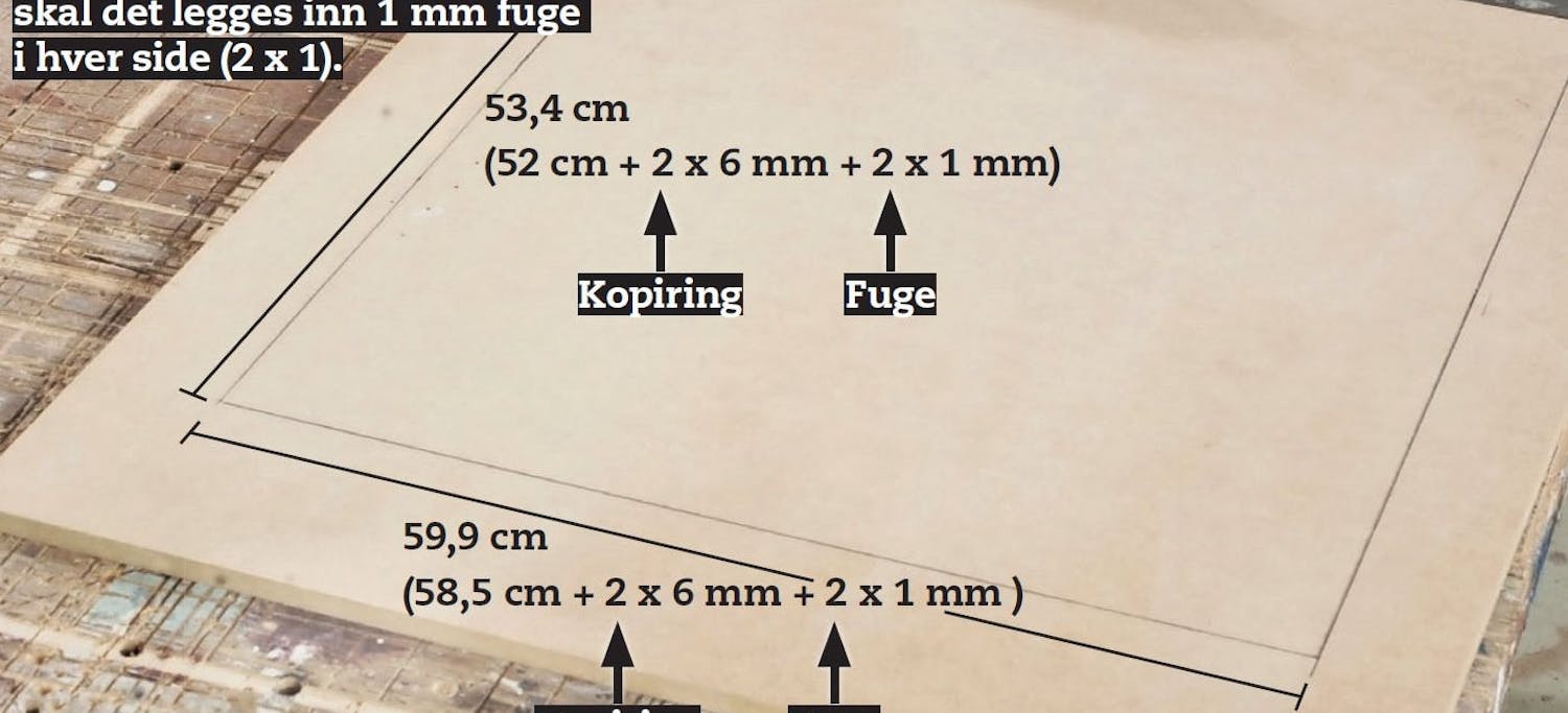 Fresemalene vi har brukt er laget av en 12 mm mdf-plate på 70 x 80 cm. Dermed har vi en stabil ytterkant som støtte, etter at vi har skåret hull til vasken.