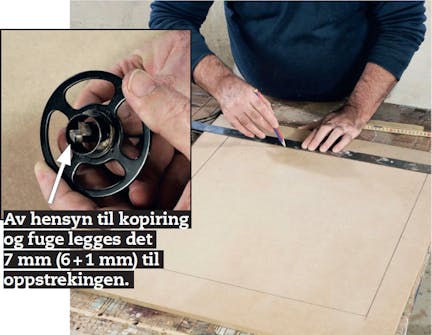 Strek først opp vaskens yttermål nøyaktig, midt på mdf -platen. Mål 7 mm ut fra oppstrekingen på alle fire sider, og strek opp igjen.