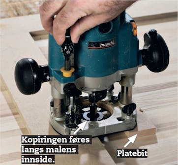 Overfresens kopiring sikrer at du kan føre fresen helt tett langs malens innside, uten noen slingring.