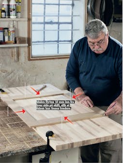 Fres ut malen, nøyaktig fra oppstrekingenes hjørne til hjørne. Bruk parallellanlegget. Fres langs innsiden av den ytterste oppstrekingen. Bruk klosser som stopp for fresen.