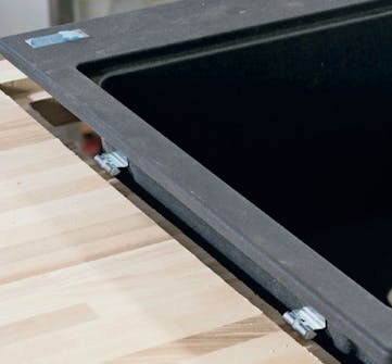 Press vasken ned i falsen, og spenn beslagene slik at vasken presses plant ned i fugemassen. Sjekk at det presses opp lim/fugemasse mellom vasken og benkeplaten; hvis det ikke gjør det, må det etterfuges.