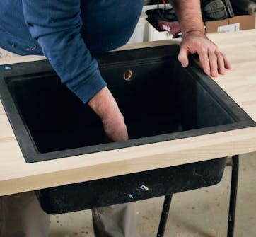 Følg den nye fresemalen. Fres i flere omganger, inntil det lange fresestålet bryter gjennom den 38 mm tykke platen og etterlater hull til vasken.