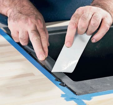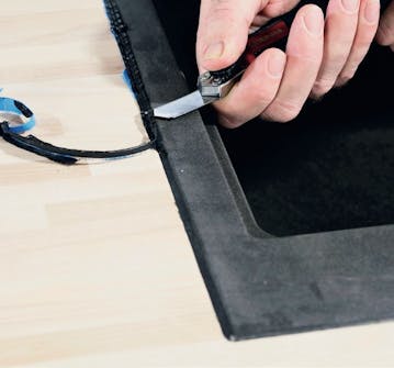 Legg i en god stripe lim i bunnen på falsen. Glatt ut med en sparkel, slik at falsens bunn er dekket med et lag på 1 millimeter hele veien rundt.