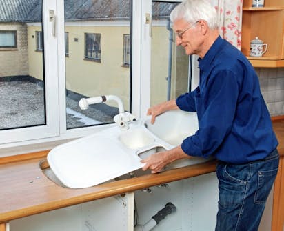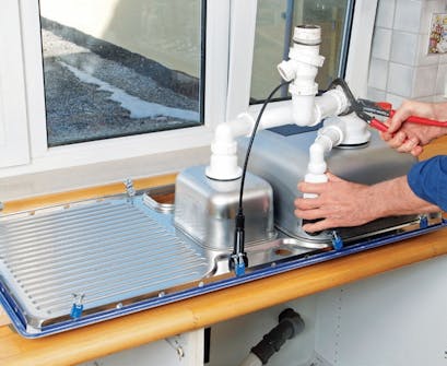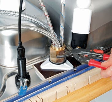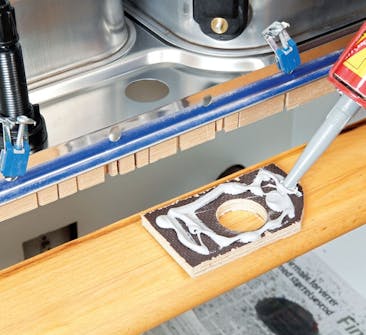 Monter en ekstra plate til blandebatteriet, slik at det ikke vrir seg. Det vil det gjøre dersom det bare festes i kanten av benkeplaten. Sag derfor til en bit vannfast kryssfiner med et hull som passer, og monter det på vasken.
