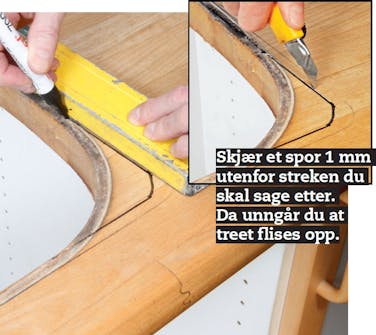 Etterpå måler du på vasken hvor mye mindre hullet i platen skal være enn kanten. Strek opp avstanden på benkeplaten. Dermed får du to streker på platen - og det er den innerste du skal sage etter.
