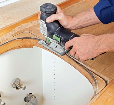 Hullet sager du ut med en stikksag. Det kan hende du trenger et ekstra langt blad hvis du også må sage gjennom toppen av kjøkkenskapene.