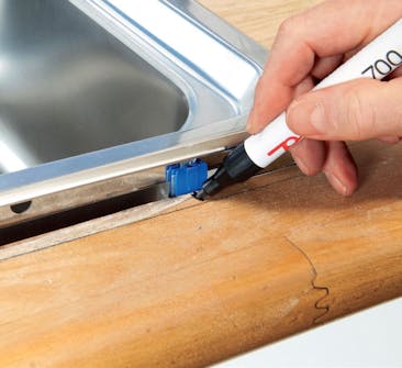 Merk opp til vaskens beslag. Sjekk først om vasken passer i hullet. Kanskje må det tas av litt mer noen steder. Når du er sikker på at hullet passer, løfter du bort vasken og markerer med streker på benken der beslagene er plassert.