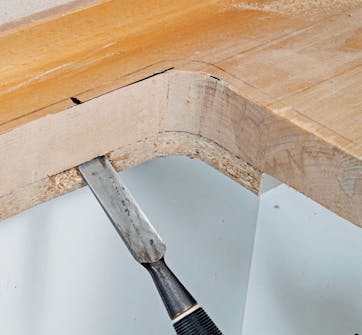 Fjern gummifugen dersom den skal skiftes. Skjær den løs med en hobbykniv. Første snitt over benkeplaten. Andre snitt langs veggen. Nå kan fugen fernes. Skjær bort evt. rester med kniven, og rens sprekken med en skrutrekker.