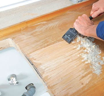 Den gamle linoljen skrapes av. En bred tohåndsskrape er svært effektiv. Her med et vendbart blad med fire skjær. Et annet effektivt verktøy er en sikling, som holdes på skrå og trekkes mot deg.