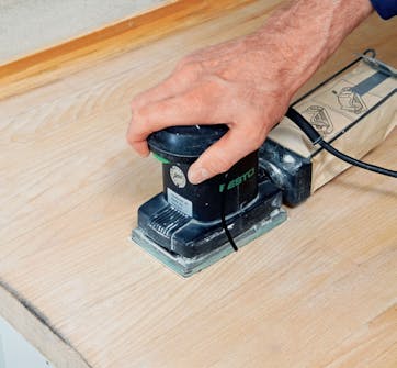 Slik skal benkeplaten slipes. En båndsliper med korn 80 er fin til grovslipingen. En plansliper er bra til neste trinn, og den kan komme helt inn i hjørnene. Bruk korn 100-120. Slip på langs etter årene, og beveg maskinen hele tiden.