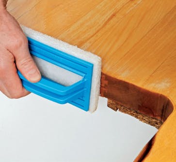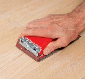 Til slutt skal det hele håndslipes med korn 150-200. Her er det en fordel med en stor slipekloss. Støvsug etterpå. Til sliping av hulkilen er det en fordel med en gummislipekloss. Vikle slipepapir rundt kanten, og press den mot fordypningen.