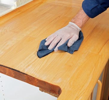 Nå skal benkeplaten mettes med olje. Hell olje ut på platen, og arbeid den ned i treet med en spesiell skrubb, eventuelt en grytesvamp. Gjenta påføring av olje på endetreet, helt til treet er mettet. Endetreet suger ekstra mye.