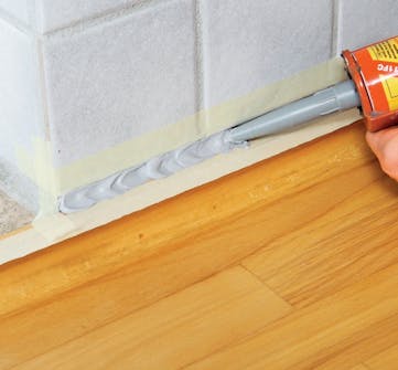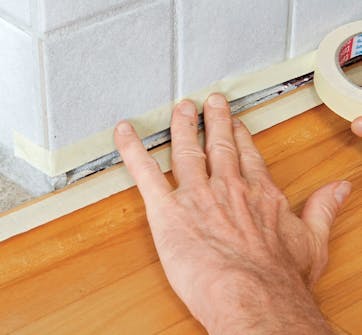 Dekk til med maskeringsteip. Fjern først alt støv og skitt i fugen med en støvsuger, slik at du sikrer god heft. Press teipen godt fast på benken og veggflisene.