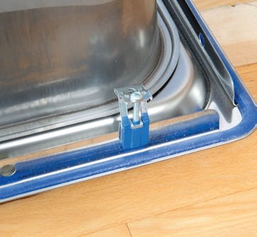 Vasken skal holde tett mot benkeplaten. Her er den utstyrt med en pakning av silikongummi under kanten. Det er en ypperlig tetning mot en treplate som beveger seg.