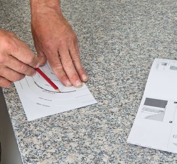 Mål opp til vasken. Normalt følger det med en mal når du kjøper vasken. Den bør du bruke - også når du skal streke opp til de avrundede hjørnene. Sjekk en gang ekstra at vasken dekker de strekene du har laget på benkeplaten.