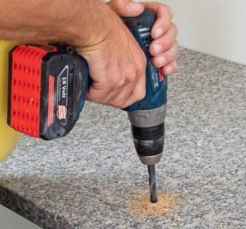 Nå kan du forbore. Bruk et 10 mm trebor for å lage et hull som bladet på stikksagen kan komme ned i.