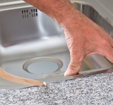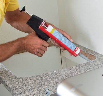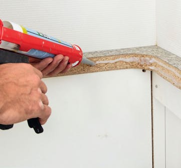 Den åpne kanten på platen forsegles med f.eks. silikon. Da unngår du at platen suger fukt og utvider seg. Legg to striper silikon, og fordel dem med en sparkel, slik at hele kanten dekkes.