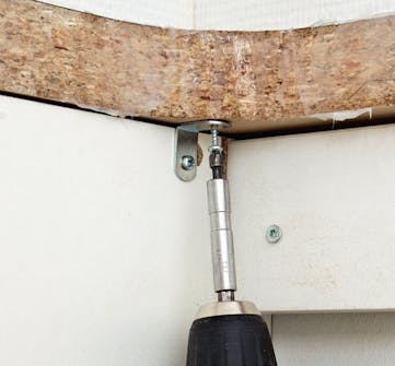 Skap og benkeplate settes sammen med to små vinkler. Her kunne den ikke sitte bakerst i skapet, så den måtte skrus fast i siden av underskapet i stedet.